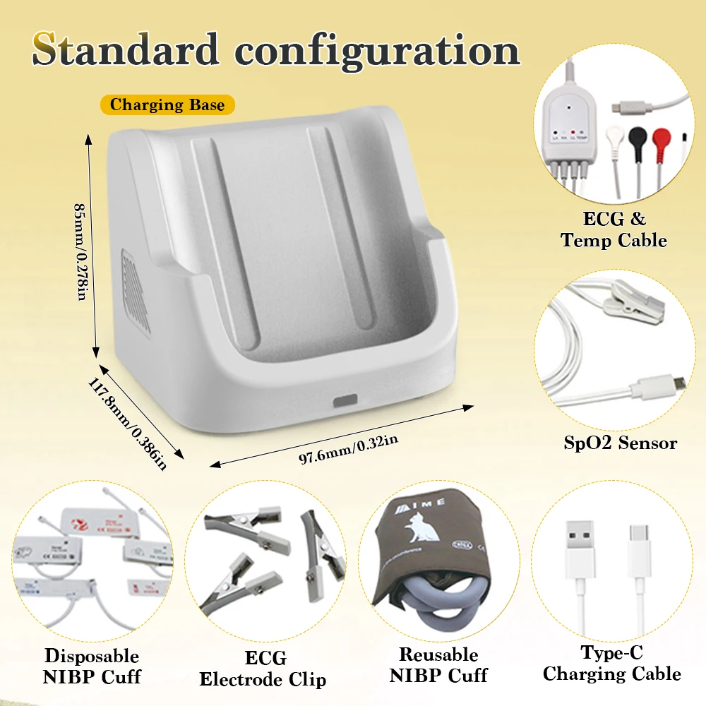 2) Monitoring Accessories maximal compatibility for all major brands (GE, Philips, Schiller, Collin, CSI, Critikon, Nihon Kohden, etc.): including, Reusable Spo2 Sensor & Ext-Cable, ECG cable, EKG cable, NIBP cuff, Air-hose, Temp probe