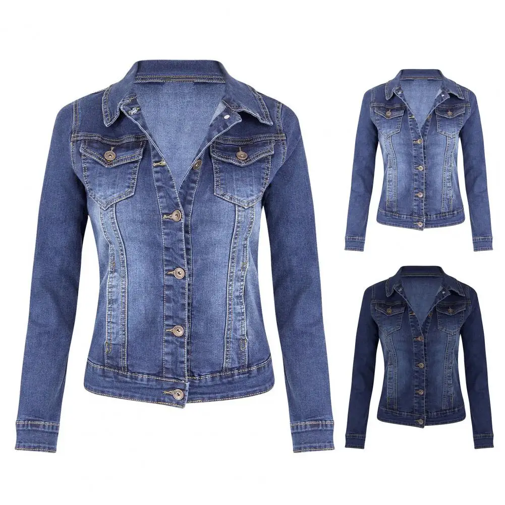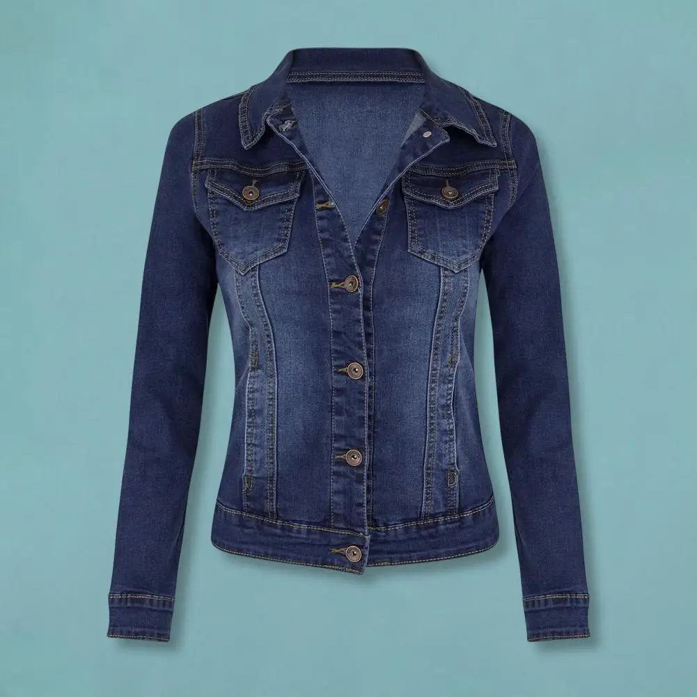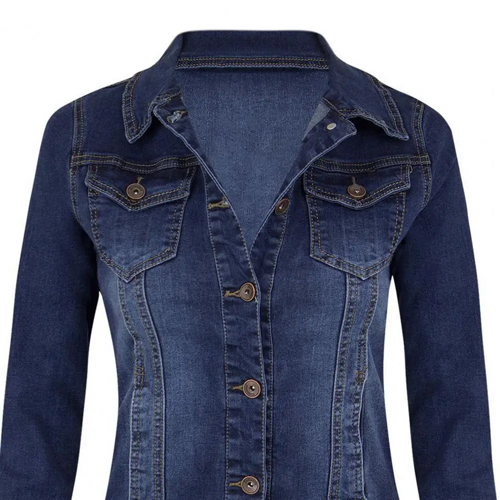 Women Denim Jacket Retro Single-breasted Slim Fit Turn-down Collar Long Sleeves Solid Color Flap Pockets Lady Coat Commuting Shopping Jacket